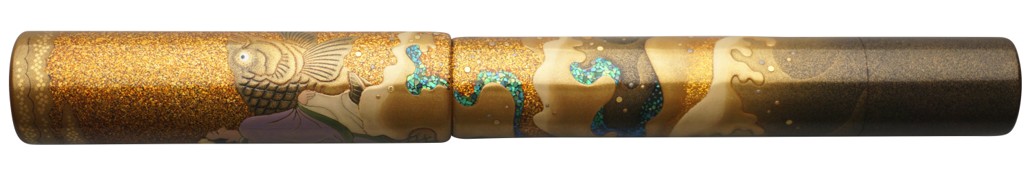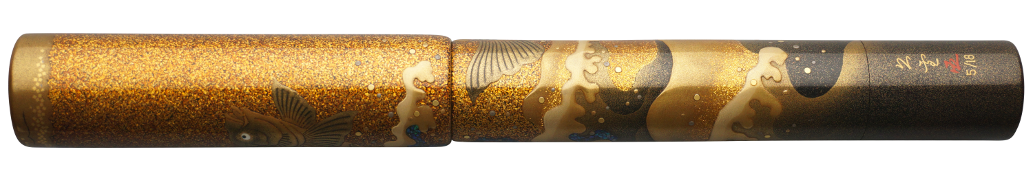 This pen was inspired by the legend of Kinko Sennin which story was believed to be originated in China but carried over to Japan. Kinko Sennin was a Daoist Sage who was a master artist at painting fish. He was friendly with fish his entire life and was later invited to the dragon king palace. A giant carp was sent to him so that he could ride it as transport for this visit (as illustrated on this pen). On his return from the palace, he meets the god of mercy who provides him a scroll that enlightens him on Buddhist principles.