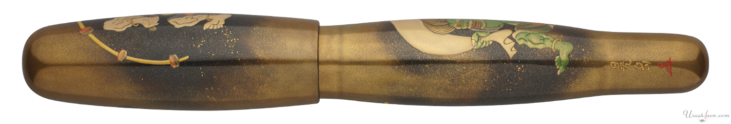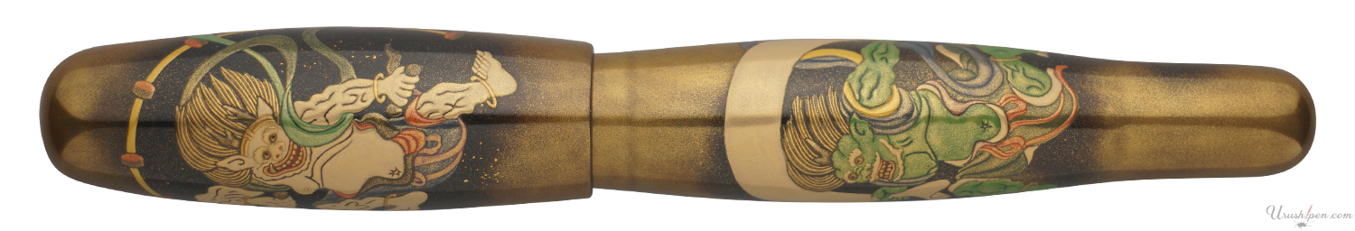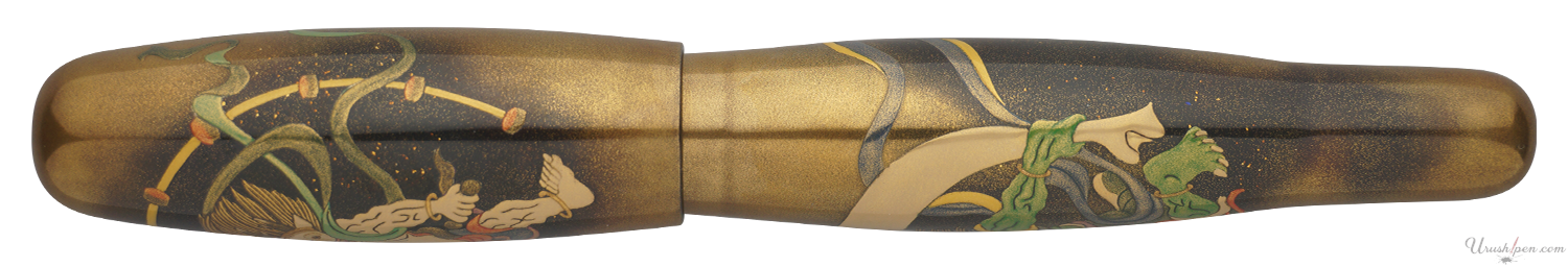 This pen is inspired by Ogata Korin's rendition of Fujin and Raijin in the 17th century (original illustration by Tawaraya Sotatsu). Fujin (wind god) is depicted on the cap and Raijin (thunder god) is depicted on the barrel. The two gods are the most notable and feared of Japanese deities. They are arch rivals to each other and constantly battle to be the ruler of the sky.